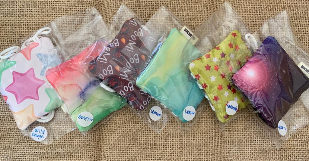 Pequeño saco de 7×7 cm aprox. hechos de tela Bistrech, con nuestros estampados originales. Rellenos de semillas maceradas en aceites esenciales de lavanda, vainilla, naranja u otros.